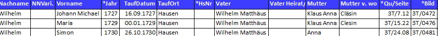 Hier im Bild ist bei einem Taufeintrag die Mutter nur mit Vornamen genannt. Durch die Sortierung in meiner Tabelle nach "Vater", in diesen Fall "Wilhelm Matthäus;", ist in 2 Fällen der Nachname der Mutter angegeben. Nun prüfen: Passt der Geburtsort, Geburtsjahr! Und "Ja es passt" der Nachname der Mutter ist "Klaus"